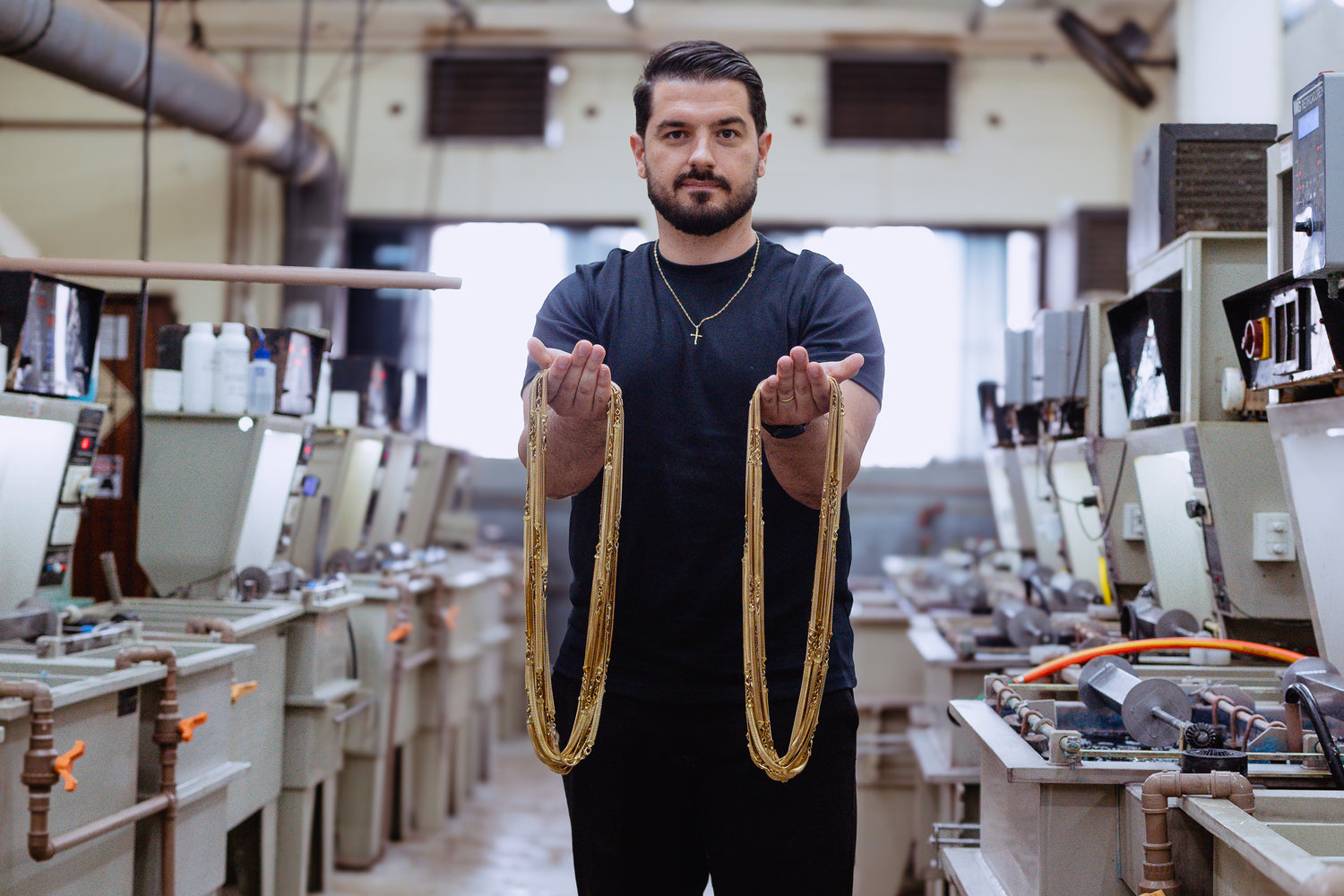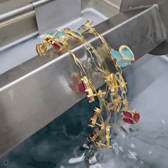 O banho é uma das etapas mais importantes no processo de uma semijoia, por isso, mesmo à frente da empresa, nossos diretores fundadores atuam ao lado do time na linha de produção.